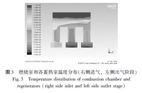 量, 因此在豎直方向蓄熱體和氣體都呈現(xiàn)出明顯的溫度梯度。同時, 當(dāng)進(jìn)氣排氣方向發(fā)生變化時, 燃燒室內(nèi)溫度也會出現(xiàn)波動, 且分布不均勻。對于燃燒室結(jié)構(gòu), 也有裝置將燃燒室頂部兩側(cè)的直角改為切角, 使得煙氣湍流充分, 減小低溫區(qū)出現(xiàn)的可能性